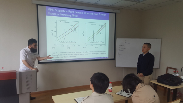 2012年毕业于英国老牌大学斯特拉斯克莱德大学(University of Strathclyde),获得了工业数学博士学位,在纳米流体、多孔介质内流动及传热过程数值模拟等方面,具有较深的造诣,其发表论文索引次数超过了2000次。此次来访,Khan博士为我院师生做了两次正式报告,分别就纳米流体传热及多孔介质内气液界面稳定性方面的基础性问题,进行了详细汇报,并与我系师生在英文期刊论文撰写、投稿技巧等诸多问题进行了广泛的交流,取得了良好的效果;Khan博士还与后期双方学生交流、科研合作等方面诸多问题,进行了深入和友好的探讨,取得了诸多共识,为我系科研工作的进一步发展,起到了一定的推动作用。