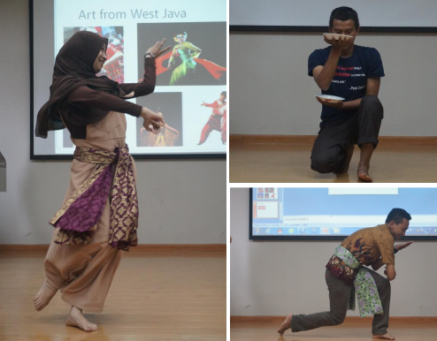 印尼同学分为两组进行了介绍,第一组Revi和Devi同学介绍的自己的家乡Bandung(即万隆),并通过图片展示了万隆的人文特色,包括大学、旅游景点、当地美食,并表演了西爪哇独有的jaipongdance和silatdance。第二组David同学向大家介绍自己所在westsumatera(即西苏门答腊省)特有的海边美景、传统建筑、湖泊、美食等,并展示了西苏门答腊特有的“盘子舞”。在这之后,日本的真那人同学和中国的李勇同学相继尝试了这些舞蹈。