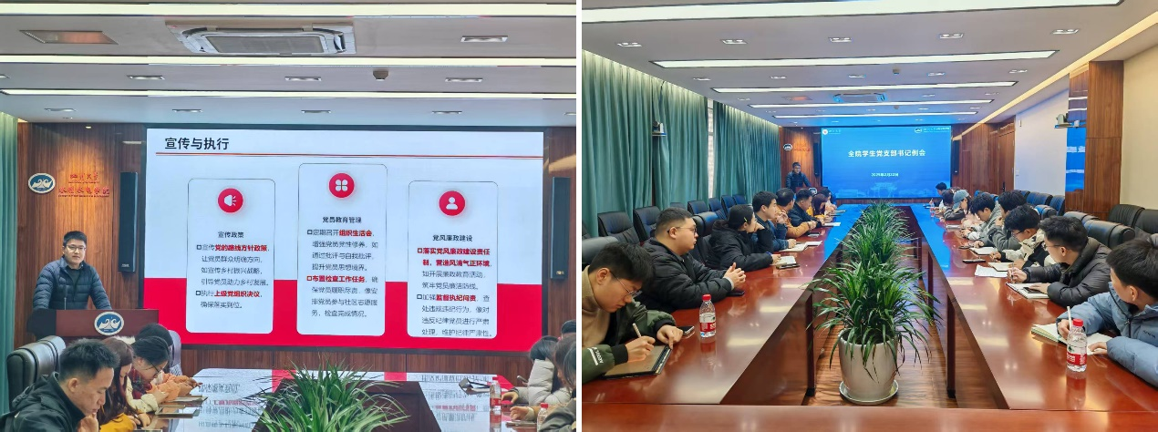 多维协同推进基层组织建设高质量发展。2024年2月22日,学院召开新学年学生干部工作部署会,采用“总-分”架构与“三会并行”模式,聚焦学生工作核心任务。会议设有学生干部主会场、班长主席团联合会议、团支部书记例会及党支部书记例会,系统布局新学年学生工作。