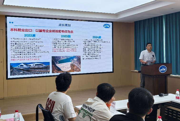 岩土与地下工程系教工党支部书记张志龙汇报近三年毕业生升学与就业情况,基于大量数据梳理了本科、硕士、博士三个层级学生的深造、就业和去向趋势。他指出,岩土类毕业生出口稳定、匹配度高,尤其在国家基础设施建设、工程咨询、政府机关等关键领域持续保持高需求态势。张老师勉励同学们要坚定信心、明确目标,在结构性利好中找准个人定位,在新一轮城市更新与西部发展战略中展现岩土人的担当与价值。