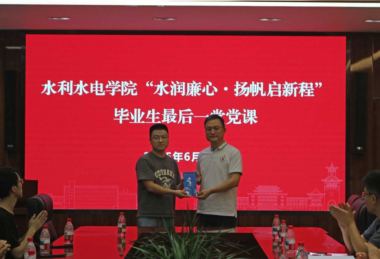 全体人员在赵毅老师的带领下在党旗下重温入党誓词,铿锵誓言彰显使命担当。学院向毕业生赠送毕业生廉洁纪念函,提醒其严守纪律红线,以“水之清廉”涵养人生境界。