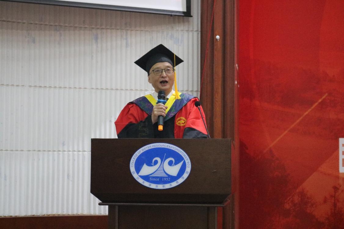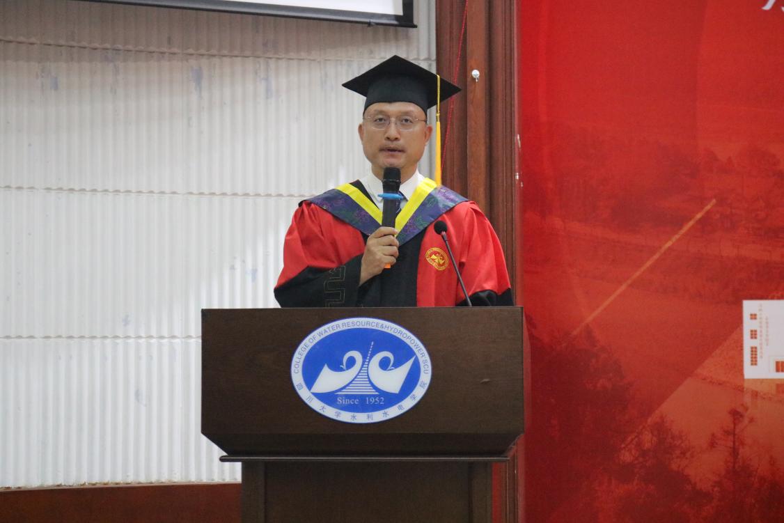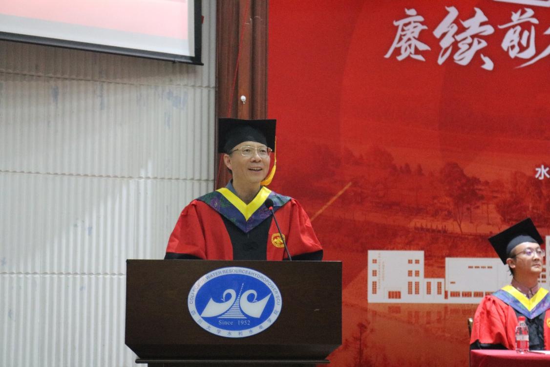 典礼在庄严的国歌声中正式启幕。院长杨兴国代表学院,向全体2025届毕业生致以诚挚祝贺与美好祝愿;向辛勤培育学生的师长和默默支持的家长致以崇高敬意。他殷切勉励毕业生:当立鸿鹄之志,淬炼过硬本领,忠于祖国、忠于人民,以奋斗之笔书写无悔青春。最后,院长深情祝愿川大水电学子:情系江河安澜志,梦筑华夏水脉长,让青春之花在祖国大地上璀璨绽放!