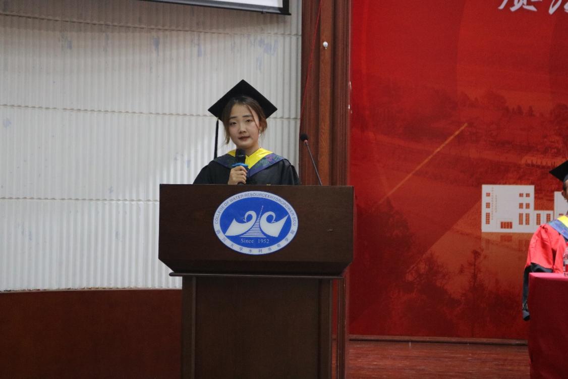 教师代表黄晓荣教授以运动场上的拼搏精神喻人生成长,结合切身经验,殷切寄语2025届毕业生:要不惧挑战、迎难而上,彰显水利人的精神风貌;要将个人理想深深扎根于祖国发展沃土,矢志投身民族复兴伟业。他最后深情祝福学子们:勇立时代潮头,激扬青春力量,谱写人生壮丽篇章!