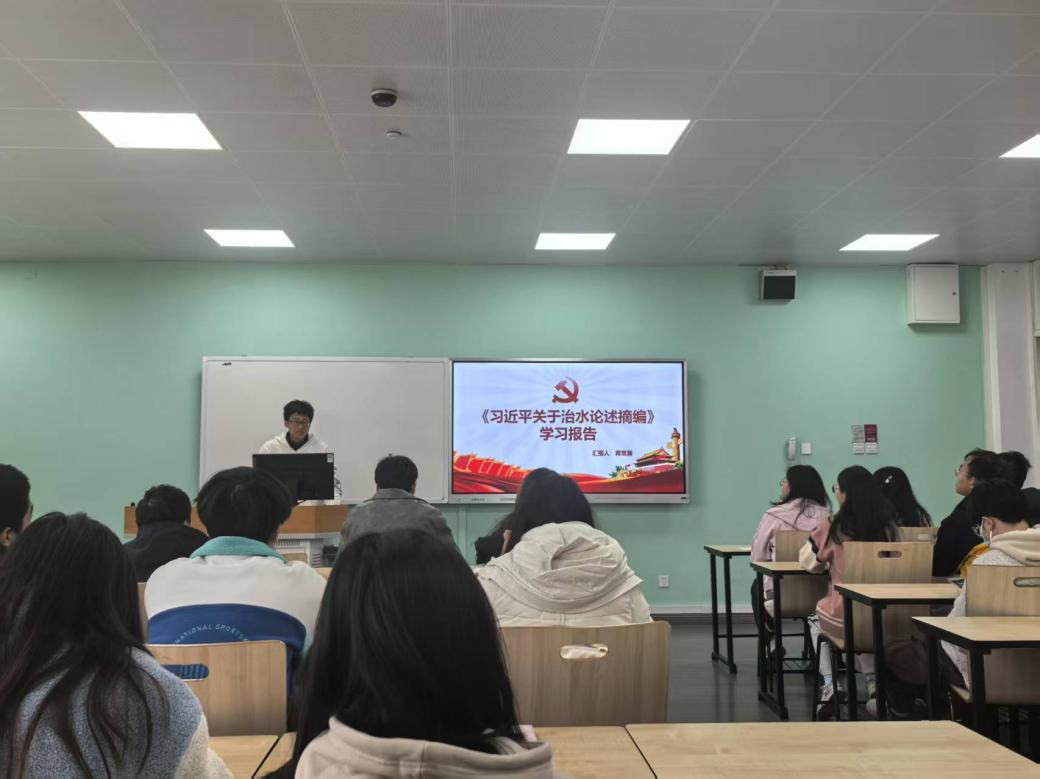 随后,2023级蒋章瀚同学进行《习近平治水论述摘编》学习报告,他从该书的基本背景、内容的六个方面、治水思路及五年规划四个方面向大家分享了他阅读后的所思所想。给同学们带来了新的思路。而2024级都干拉姆同学则是向同学们分享了优秀党员的事迹,为同学们提供了奋斗参照,让大家看到信仰力量与责任担当,鼓励同学们树立远大志向,汲取奋进动力,实现人生价值