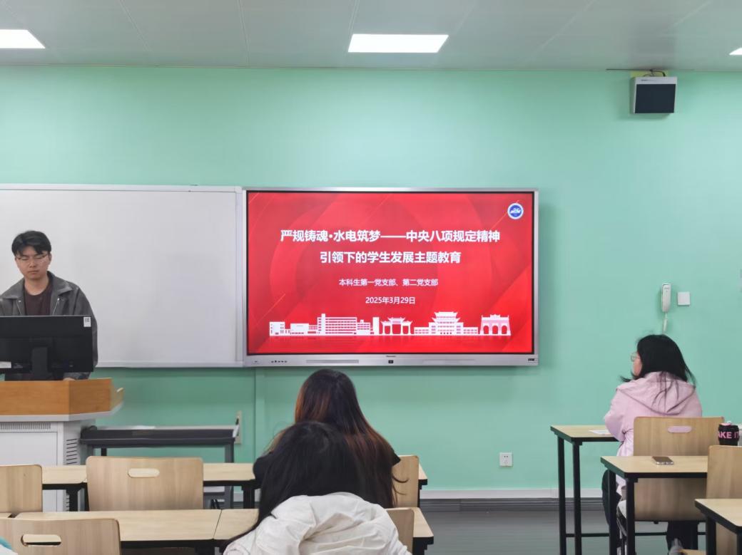 为深入学习中央八项规定精神,3月29日上午,本科生第一、第二党支部在江安校区综合楼B座506开展以“严规铸魂水电筑梦——中央八项规定精神引领下的学生发展主题教育”为题的主题党日。水利水电学院院长杨兴国教授作为主讲嘉宾参加本次活动,本科生第一党支部副书记李昌辉担任主持。